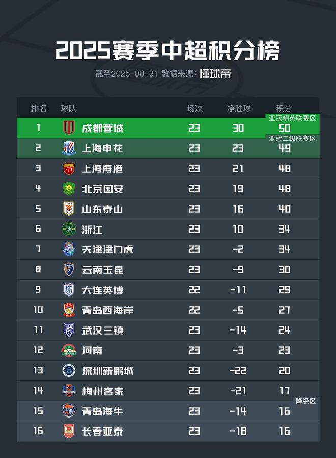 8月31日,北京时代是中国超级联赛的第23轮比赛,除了推迟的Inbev vs. West Coast外,还完成了七场比赛。在冠军小组中,成都以4-1击败了Macan,Shenhua输给了三个城市0-1,而Guan输给了Chandon。在这一轮比赛之后,成都以50分的成绩超过了排名,申豪得到49分,Haigang和Guoan得分48分,Haigang暂时占据了第三名,在目标差的优势中占据了第四名。泰桑(Taishan)获胜后以40分排名第五。 Zhijiang在击败Tianjin Tigers之后排名第六,Tianjin Tigers排名第七,Yunnan获得30分,Yingbo获得29分,西海岸在第十位获得了第十位。在降级的小组中,桑岑(Sanzen)在赢得比赛后获得24分,在第11位的恩南(Enan)超越恩南(Enan),恩南(Enan)排名第12位,新彭施楚(Xinpengccheng)以2-0击败梅伊兹(Meizhou),第13位,梅伊兹(Meizhou)比降级区高1分,并得分17 puntos。在一起,法力Tee和Yatai得16分,由于目标的差异,海牛从底部排名第二,但Yatai仍处于底部。