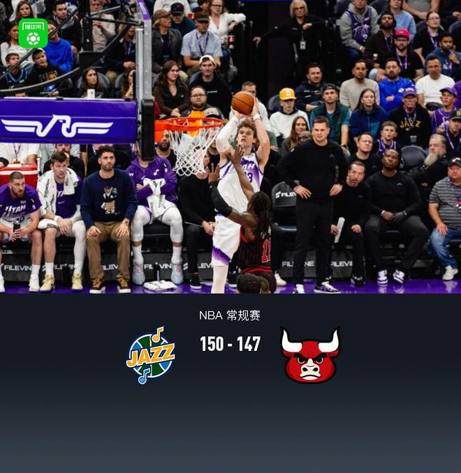 北京时间11月17日,NBA常规赛犹他爵士队主场迎战芝加哥公牛队。半场结束公牛队比分61-70,终场公牛队150-147。犹他爵士队的马尔卡宁得到47分、7个篮板和2次助攻,而科扬泰·乔治得到34分、2个篮板和6次助攻。芝加哥公牛队的科比·怀特得到27分、4个篮板和8次助攻,约什·圭迪得到26分、12个篮板和13次助攻。第一节爵士队马尔卡宁拿下9分,公牛队菲利普斯队拿下8分。首节爵士队以33-33击败公牛队。第二节,爵士队的马尔卡宁得到9分,公牛队的乔什·圭迪得到10分。半场结束爵士队61-70领先。第三节,公牛爵士队的马尔卡宁得到13分,公牛队的武切维奇得到7分。第三节结束,爵士队94-98领先公牛队。爵士马尔卡宁第四节拿下12分。公牛队的乔什·吉迪 SC得到了九分。第四节结束,爵士队12 7-127公牛队 加时赛爵士队基安特·乔治得到12分,公牛队的科比·怀特得到8分,爵士队最终以150-147击败公牛队。全场数据,犹他爵士队马尔卡宁得到47分7篮板2助攻2抢断2盖帽,基扬特乔治得到34分2篮板6助攻4抢断,森萨博得到16分6篮板1助攻1抢断。芝加哥公牛队科比-怀特得到27分4篮板8助攻1抢断,约什-圭迪得到26分12篮板13助攻2抢断2盖帽,武切维奇21分13篮板2助攻3盖帽。犹他爵士队首发阵容:马尔卡宁、基扬特·乔治、米哈伊柳克、艾斯·贝利、努尔基奇。芝加哥公牛队:乔什·吉迪、武切维奇、布泽利斯、赫尔特、奥科罗。